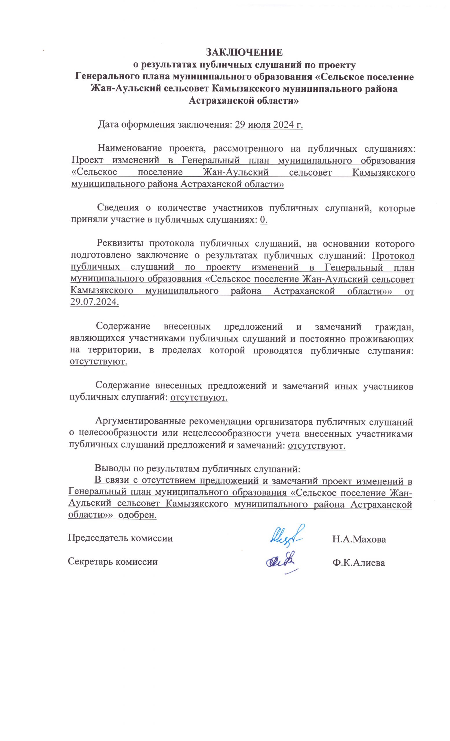 | ЗАКЛЮЧЕНИЕ о результатах публичных слушаний по проекту изменений в Генеральный план муниципального образования «Сельское поселение Жан-Аульский сельсовет Камызякского муниципального района Астраханской области» с. Жан-Аул 30.10.2023 г. |